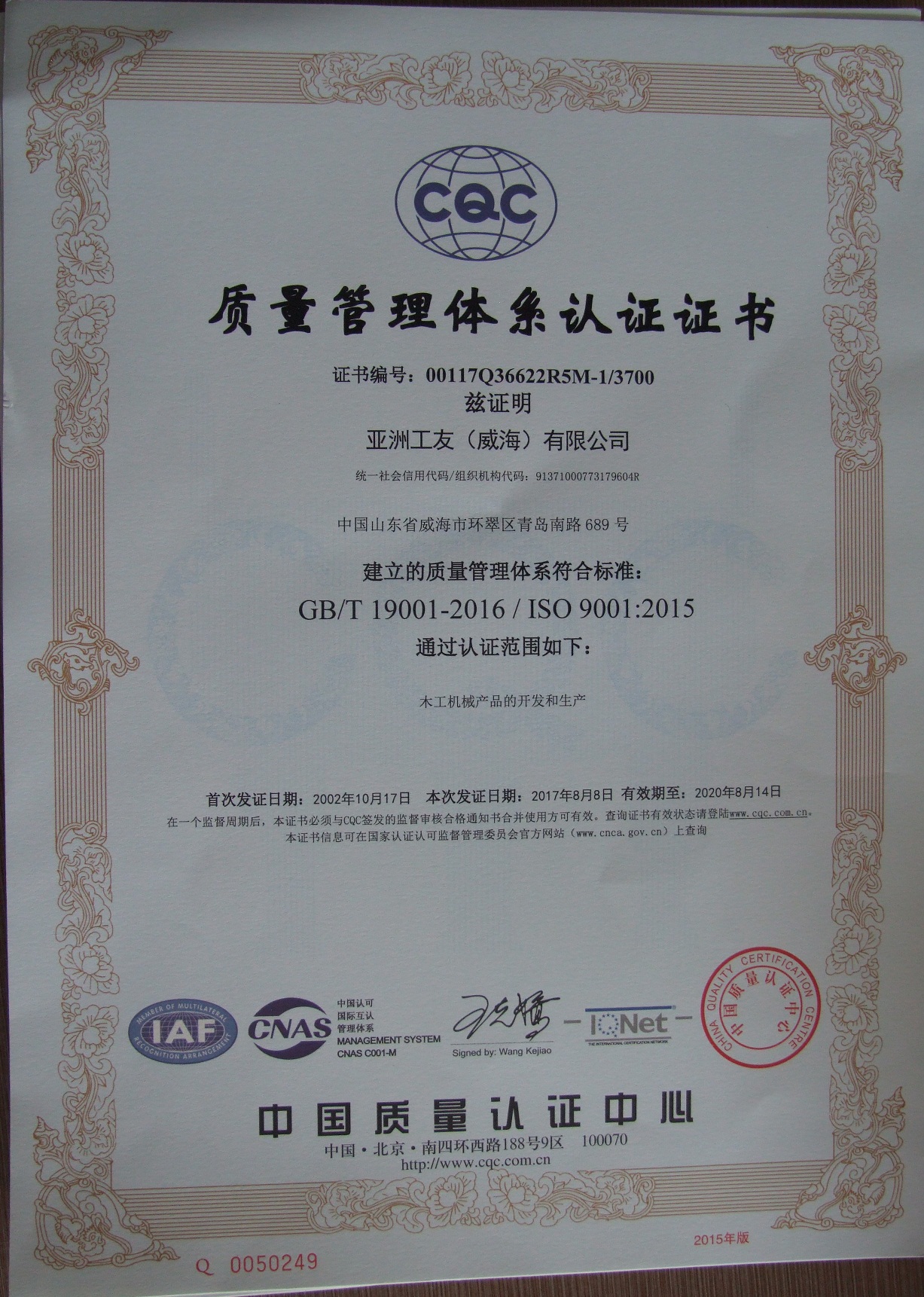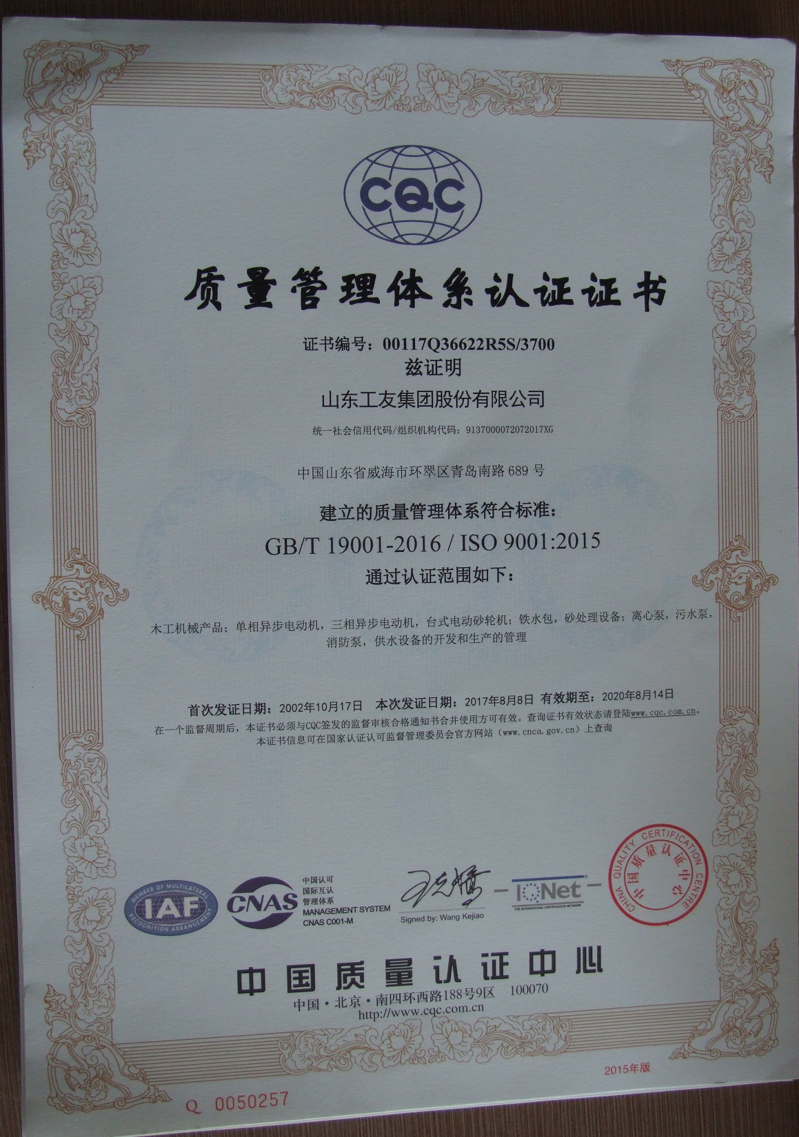 815日,公司收到了中國質(zhì)量認(rèn)證中心頒發(fā)的新版標(biāo)準(zhǔn)證書。至此,2017年體系換版換證的工作圓滿結(jié)束。