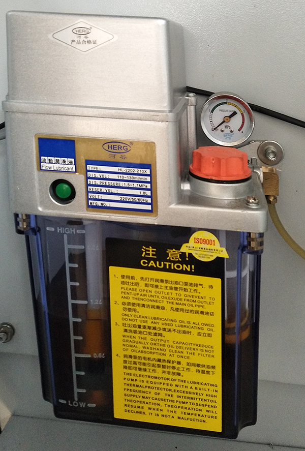 ◆采用日本河谷微電腦自動(dòng)控制注油系統(tǒng),主動(dòng)控制油量,保證導(dǎo)軌充分潤(rùn)滑,減少浪費(fèi),保證機(jī)床導(dǎo)軌的使用壽命。
